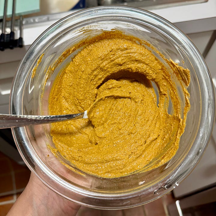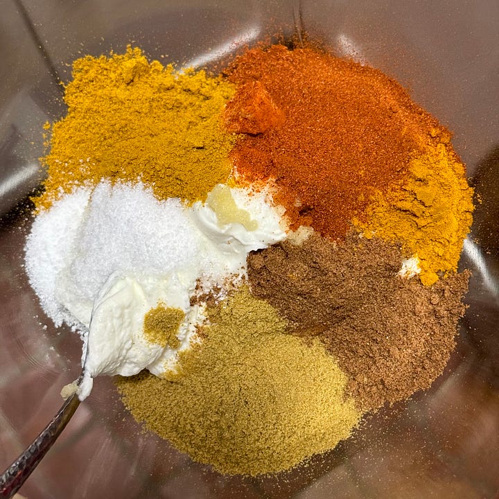 Seamless spice connection. I love spicing whatever plain veg I’m serving on the side with the same spices used in the marinade/sauce. It’s a nice way to dress up boring veg without taking it in a different direction than the main. I sprinkled a smidge of garam masala, cumin, paprika, and curry powder on cauliflower, tossed it in oil and it was delish. 😙