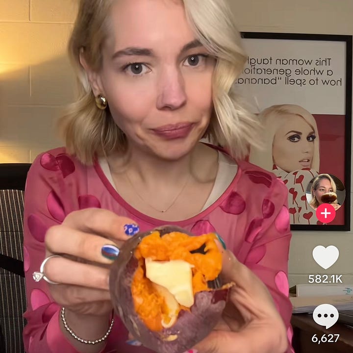 A teacher on TikTok is showing off the insane bunny rabbit-coded meals she brings to work (this one actually scares me) and people are losing their minds over this snack. What is it? A hunk of cheese shoved into a baked sweet potato.
