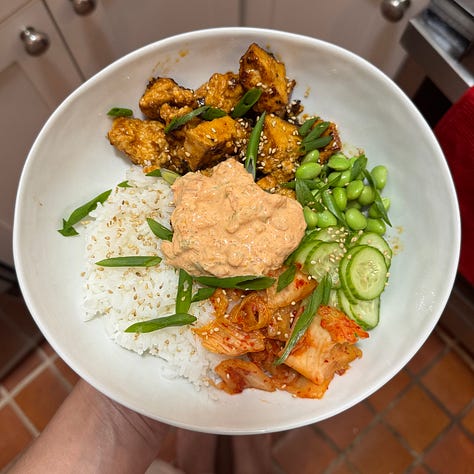 Kimchi Tofu Bowls: Also very good with boneless, skinless chicken thighs instead of tofu.