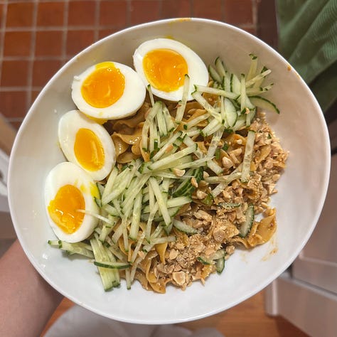 10 Minute Chili Peanut Noodles: Added soft boiled eggs for a little extra ‘tein.